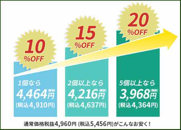 定期コースは初回50%割引(当サイト経由の場合)で、継続は最大20%の割引が適用され、購入数によって送料や代引き手数料が無料になります。