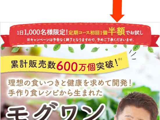 公式サイトの最上部に50%割引の表示があれば、そこが最安値の公式サイトになります。